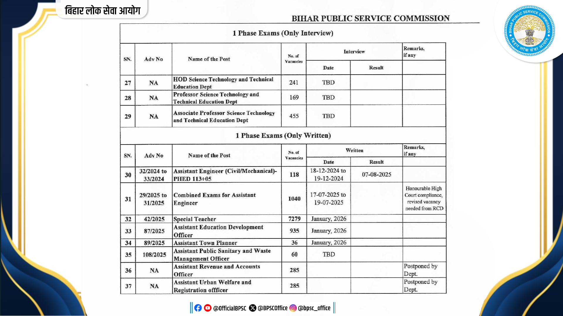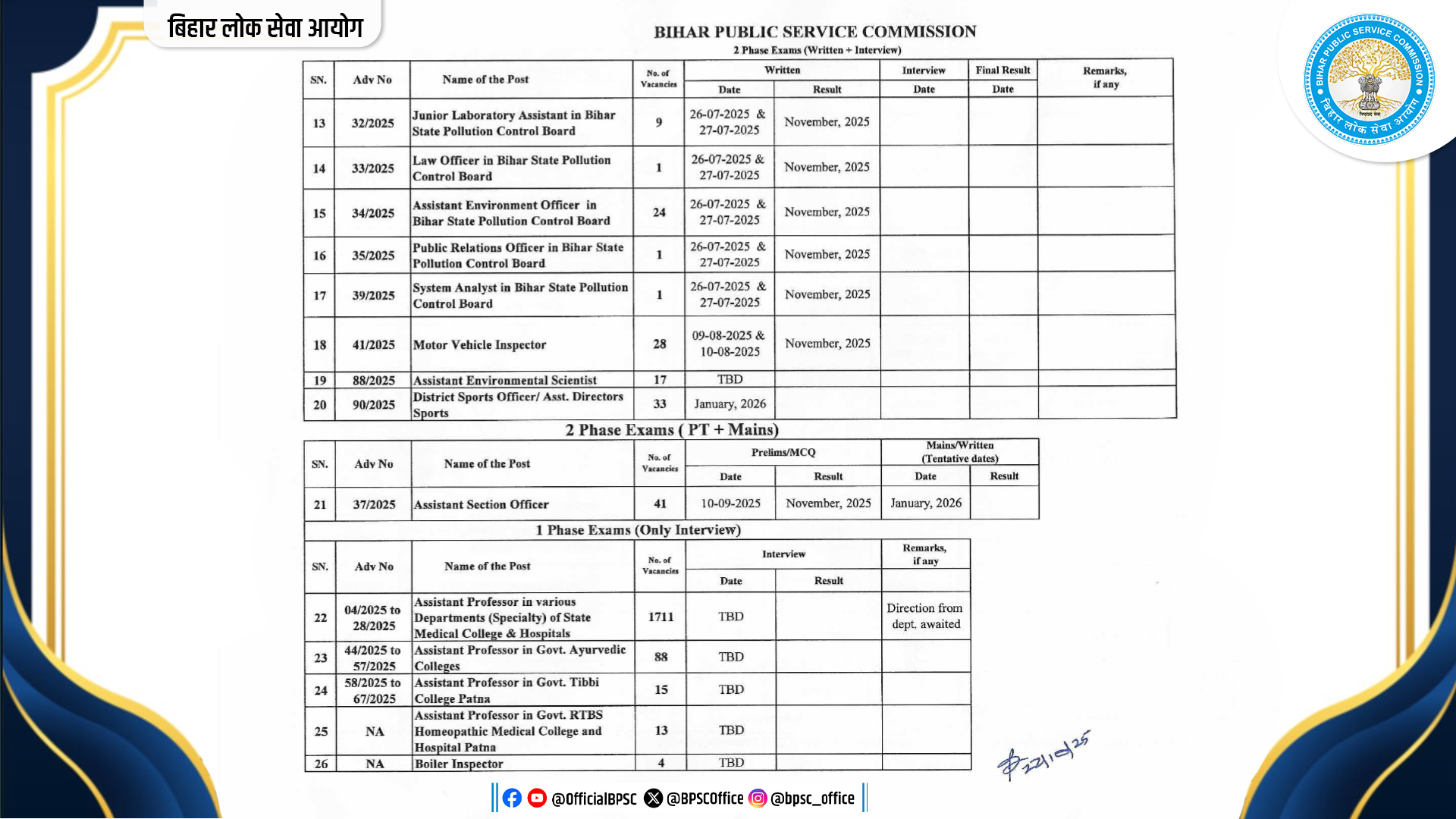 - Assistant Professor (Physics): लिखित परीक्षा 23 अक्तूबर 2022 को हुई थी। इंटरव्यू 13 अप्रैल 2023 को पूरा हुआ। अंतिम परिणाम नवंबर 2025 में घोषित होगा।